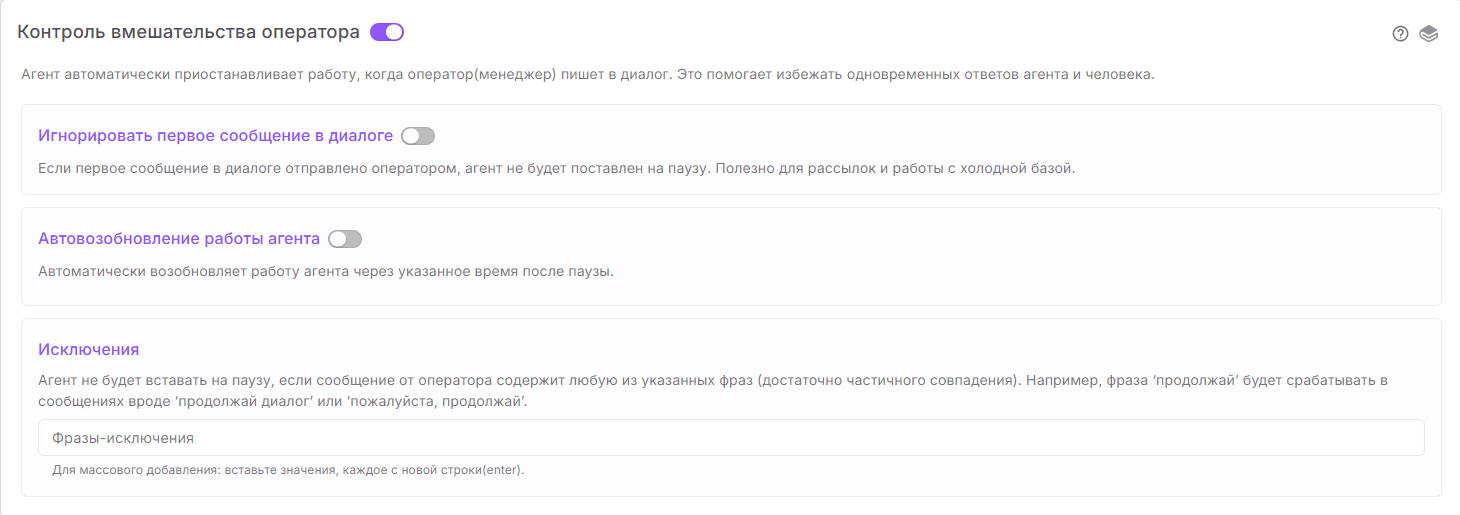 Если активировать опцию "**Контроль вмешательства оператора**", ИИ-агент автоматически прекратит работу, как только оператор начнет участвовать в диалоге. Это означает, что ИИ больше не будет отвечать на сообщения, чтобы избежать недопонимания или путаницы.